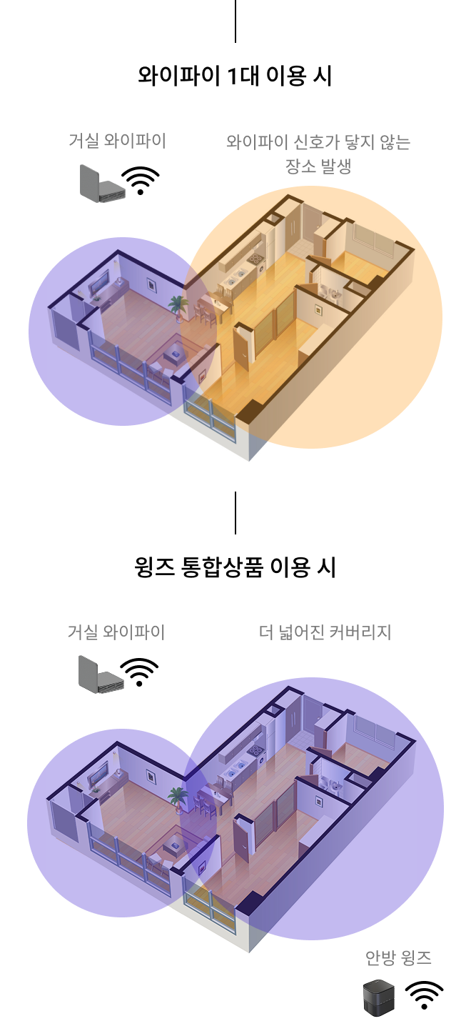 윙즈 통합상품 이용 시 : 거실 와이파이로 더 넓어진 커버리지 가능