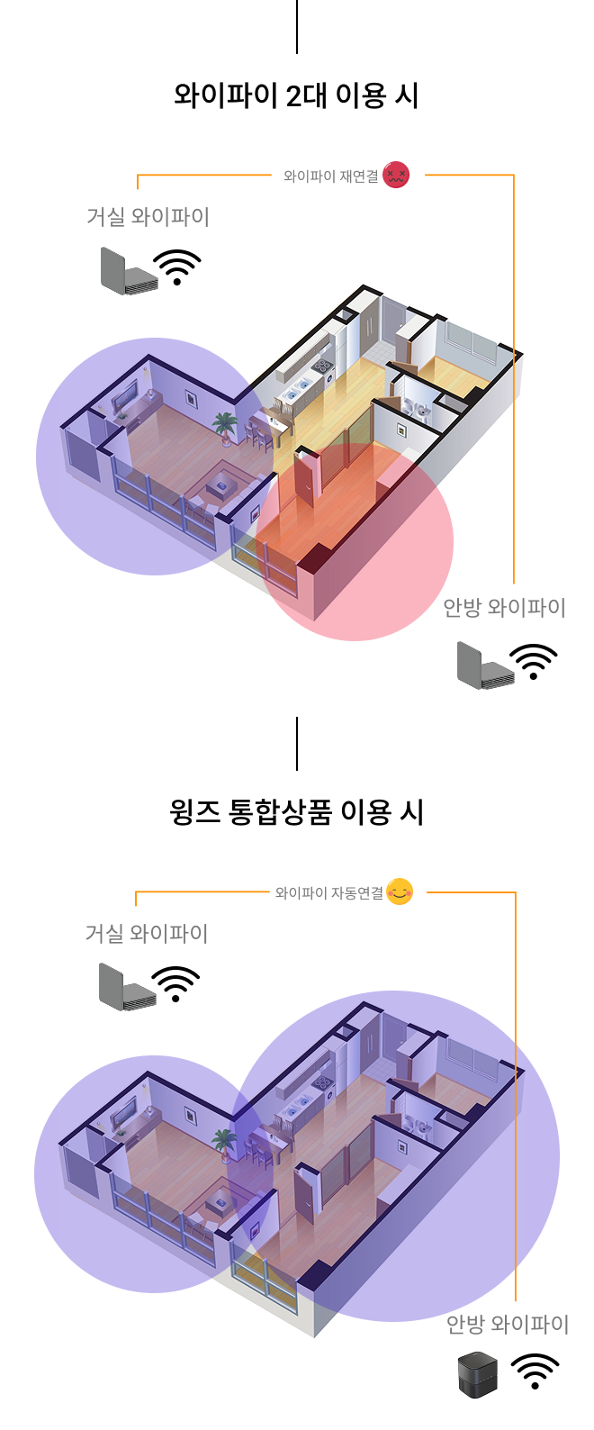 윙즈 통합상품 이용 시 : 거실 와이파이와 안방 와이파이 자동연결 가능